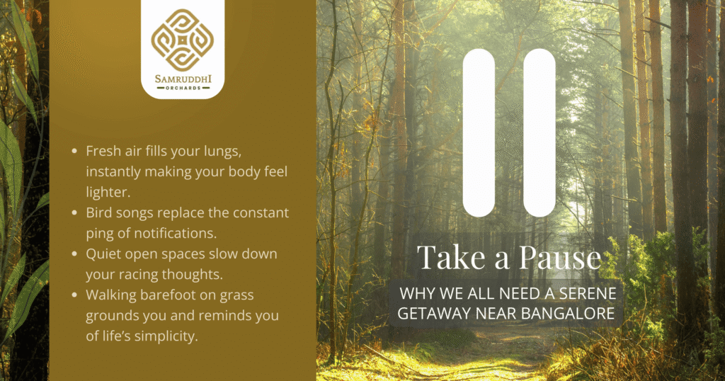 Imagine arriving at a Farmstay Getaway near Bangalore after a week of non-stop activity. You step out of the car and instantly notice how different the air smells earthy, fresh, alive. You hear birds singing instead of honking cars.